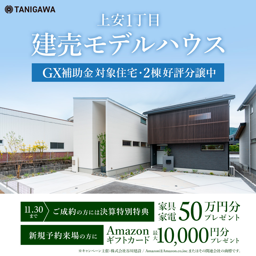 谷川建設の上安建売モデルハウス2棟は、すでにGX補助金の厳しい要件(断熱等級6以上、高い省エネ・創エネ性能)を満たし、GX補助金取得済み住宅の状態でお客様にご提供しています!!