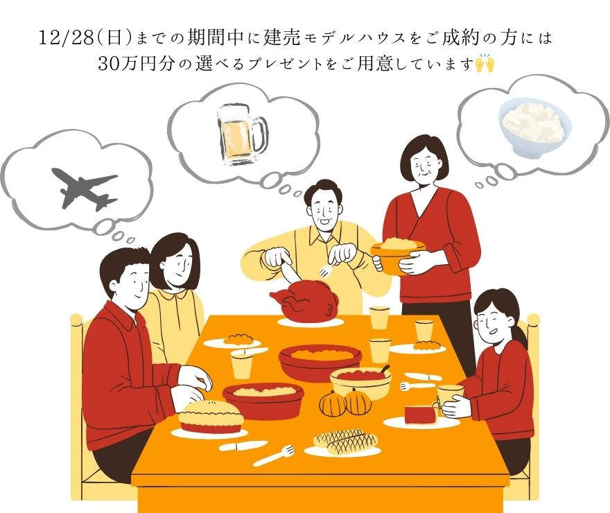 12/28(日)までの期間中に建売モデルハウスをご成約の方には30万円分の選べるプレゼントをご用意しています
