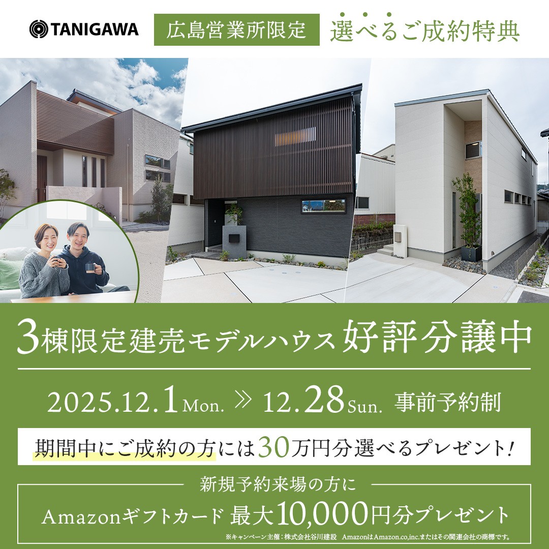 平屋と2階建て、唯一無二のモデルハウスを3棟 好評分譲中!! 12/28までに建売モデルハウスをご成約の方には30万円分の選べるプレゼントをご用意しています。