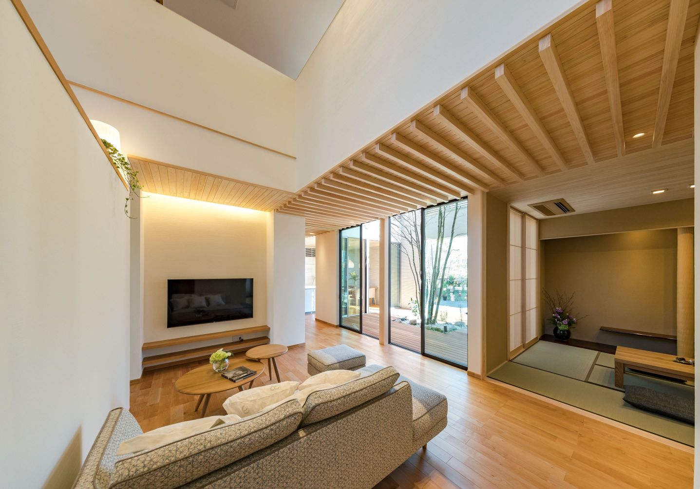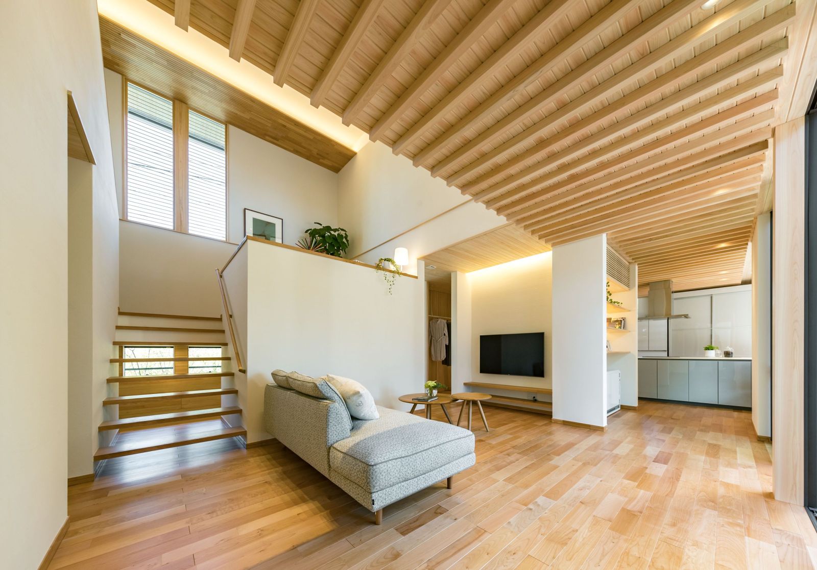 室内空間を外に広げるオープンデッキと開放感のある吹き抜けで、光や風を楽しめる、自然を感じさせる空間を演出。