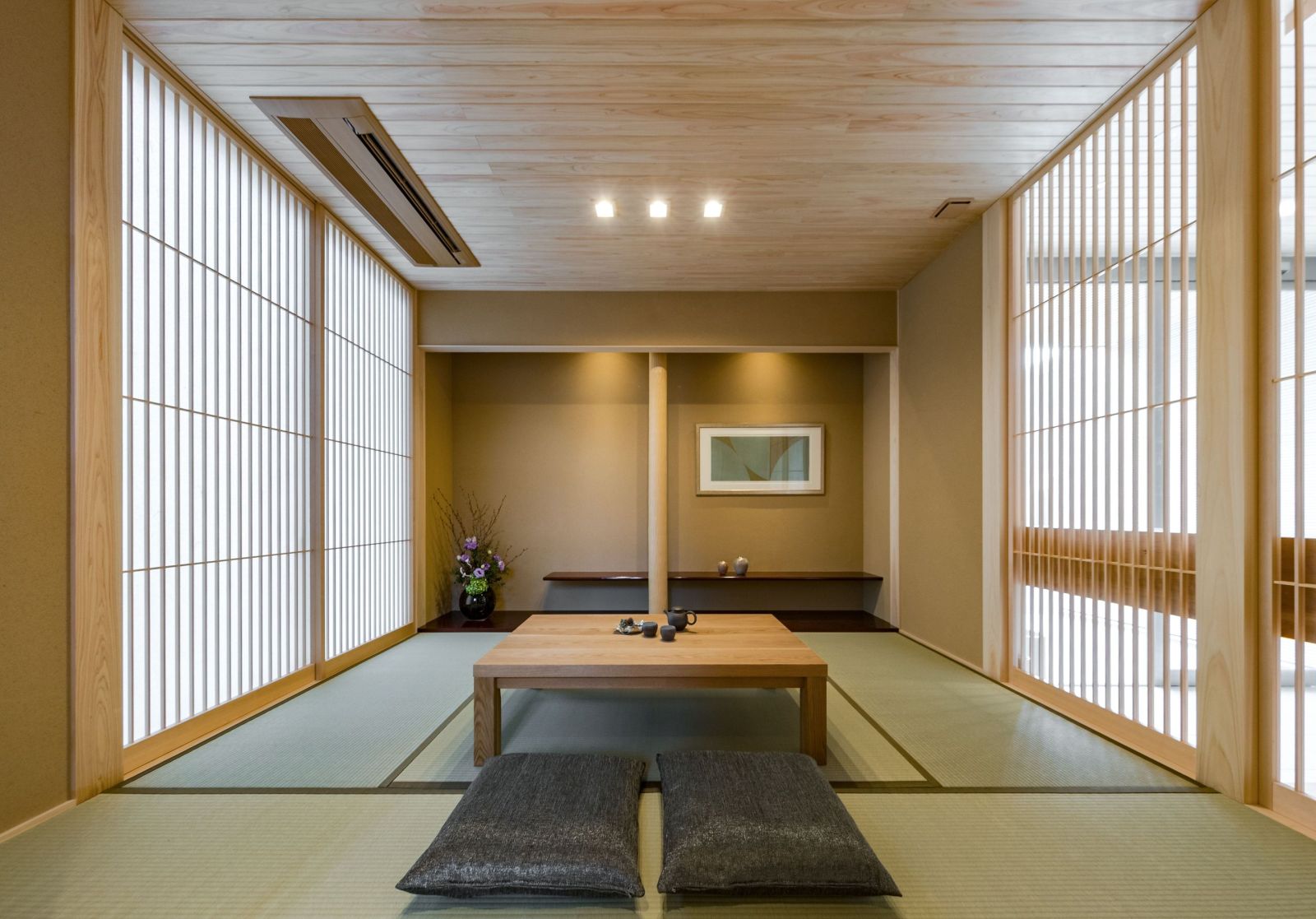 檜の香り漂う柱や、障子越しの柔らかな光に包まれる、凛とした佇まいの最高のおもてなし空間。