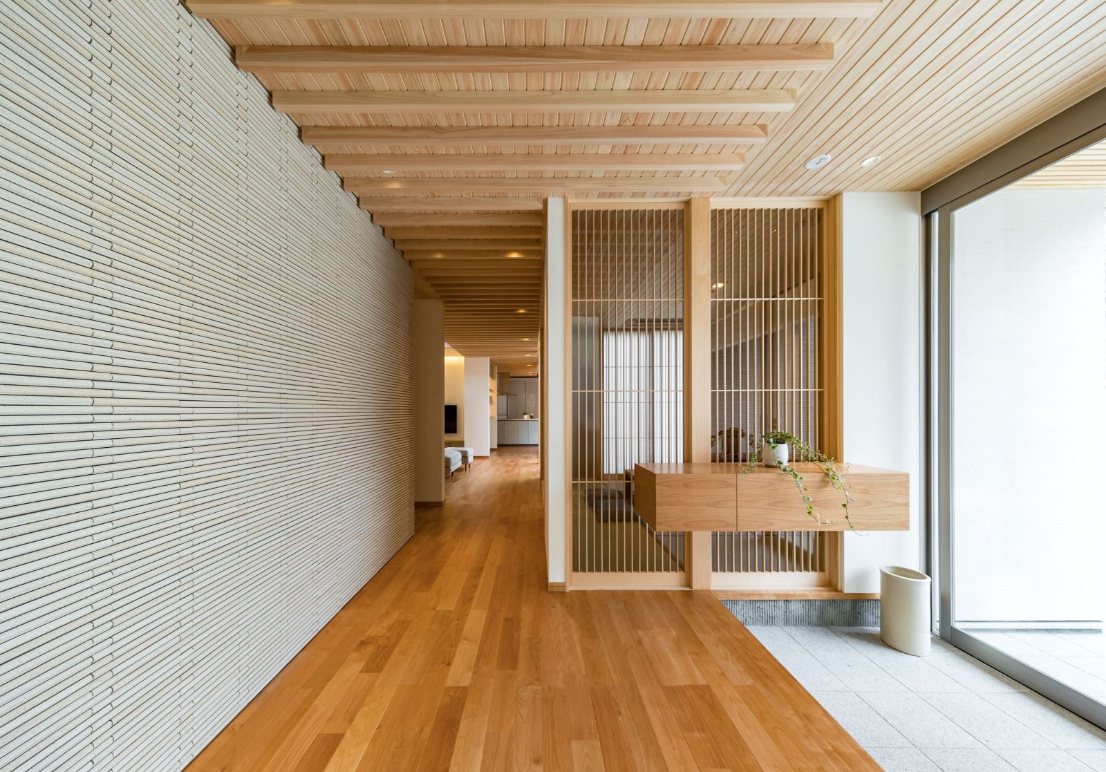 - 檜の縦格子で光の陰影を楽しめる空間演出